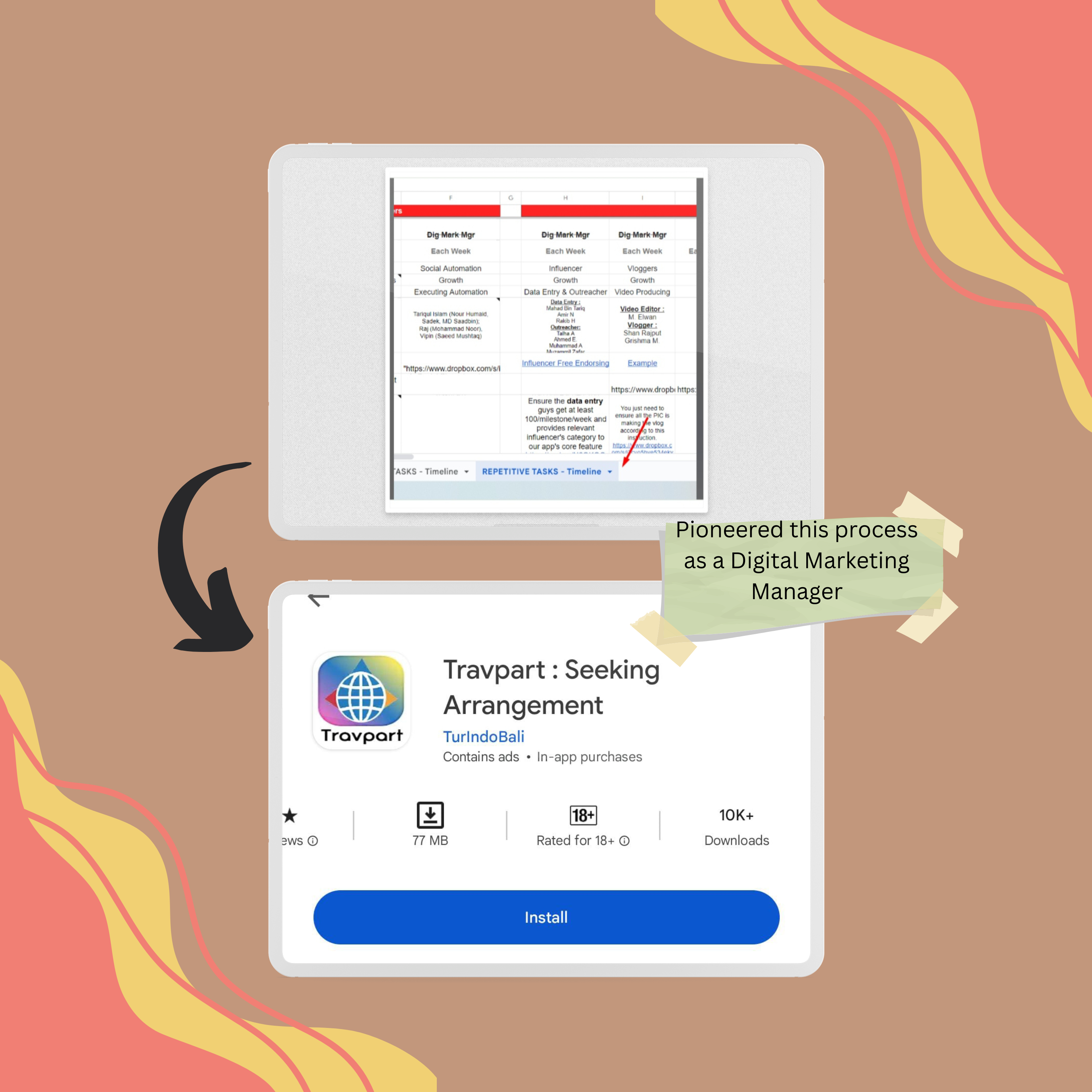 Digital Marketing Manager, Travpart, Indonesia As the Digital Marketing Manager of Travpart, A travel-based tech startup based in Indonesia, I led a group of freelancers ranging from data compilators, influencers, Cold Email/DM experts, Vloggers and Social media managers on an organic leads generation campaign.